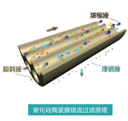 SIC膜過(guò)濾分離系統多采用“錯流過(guò)濾”形式對液體進(jìn)行分離,原料液在膜管內高速流動(dòng),在壓力驅動(dòng)下含小分子成分的澄清滲透液沿與之垂直方向向外透過(guò)膜致密層,含大分子成分的渾濁濃縮液被截留,從而實(shí)現流體的澄清、分離、濃縮、提純的目的。