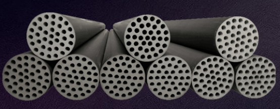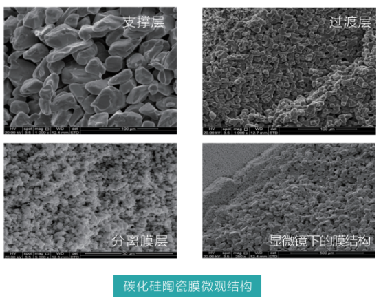 碳化硅陶瓷膜(SIC)采用重結晶技術(shù)通過(guò)高溫燒結而成,其分離層、過(guò)渡層以及多孔支撐層全部為SiC材料,其過(guò)濾精度多為微濾和超濾。按膜結構不同一般分為管式膜和平板膜。管式膜由分離層、過(guò)渡層和支撐層組成,平板膜由分離層和支撐層組成。