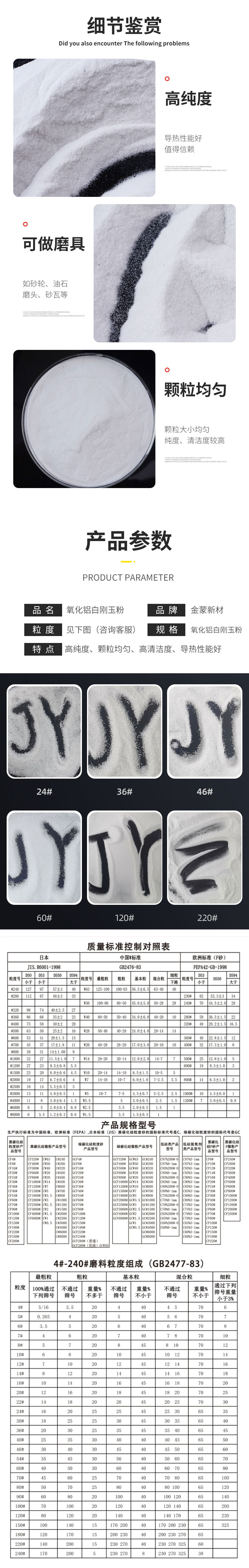 - 磨料常用粒度: 12, 14, 16, 24, 30, 36, 46, 60, 80, 100, 120, 150, 180, 200, 220, 240, 280, 325#.